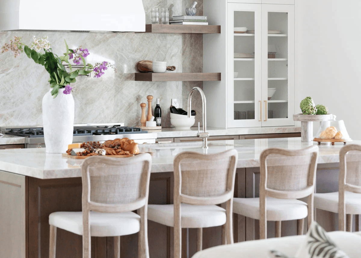 Kitchen material coordination across countertops, flooring, tile, paint, and finishes for a cohesive aesthetic.